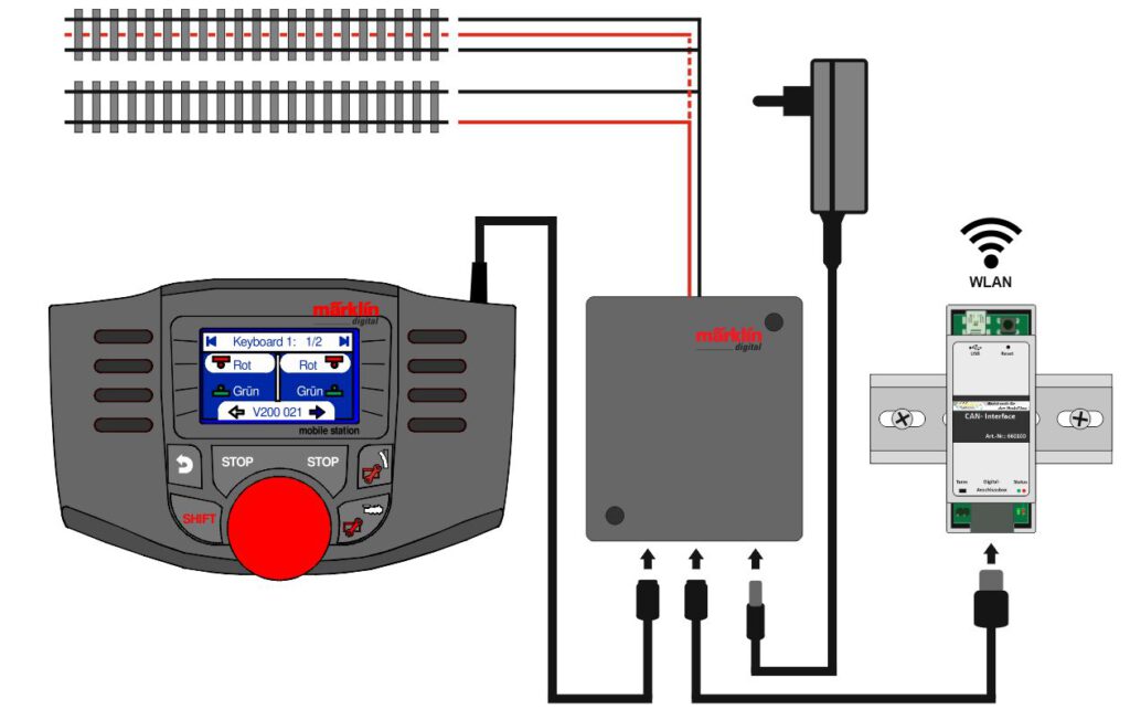 Dazu wird das CAN-Interface direkt an die Gleisbox von Märklin¹ ohne ein zusätzliches Netzteil angeschlossen und wird darüber mit Strom versorgt. Es verfügt über WLAN, über das die Verbindung zum PC bzw. über einen WLAN-Router hergestellt wird. Konfiguriert wir das CAN-Interface über das eingebaute Web-Interface.