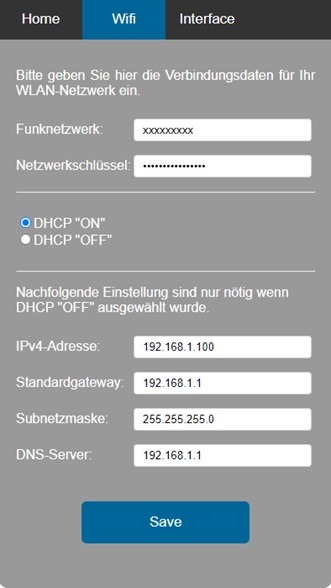 Für den Erstbetrieb lassen Sie DHCP-Einstellung auf „DHCP ON“ stehen. Das Interface erhält dadurch eine freie IP-Adresse durch Ihren Router zugeteilt.