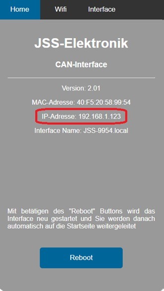 Nachdem das CAN-Interface neu gestartet wurde und Ihr PC/Laptop wieder in Ihrem WLAN befindet, können Sie das Interface nochmals mit seinem Namen oder der IP-Adresse im Internetbrowser aufrufen.