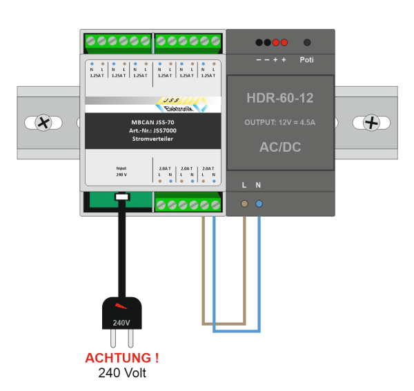 - Schließen Sie die vorgesehenen Hutschienen-Netzteile an die jeweiligen Stromausgänge an.